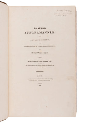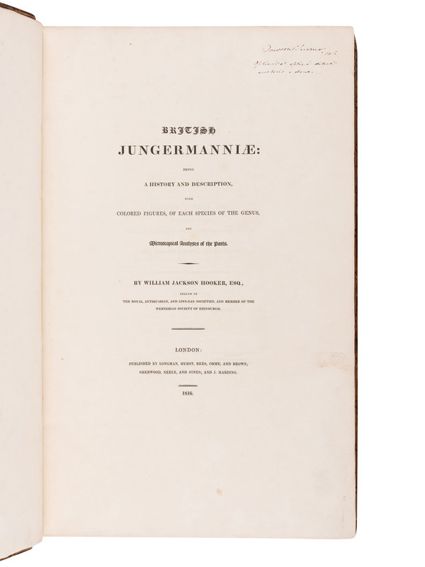 FIRST EDITION, PRESENTATION COPY TO THE DEDICATEE DAWSON TURNER, ONE OF 10 OR FEWER LARGE-PAPER COPIES of Hooker's "most beautiful work" (DSB) INSCRIBED BY HOOKER: "Not above 10 copies printed in folio -- Dawson Turner from the Author." Dawson Turner was Hooker's father-in-law, and a noted botanist in the field of cryptogamic plants. He was the author of Natural History of Fuci, and formed a large collection of algae, which was later integrated with Hooker's herbarium at Kew. ADDITIONALLY SIGNED BY TURNER. Nissen BBI 916; Stafleu & Cowan 2987.