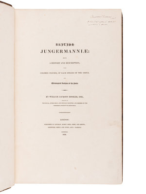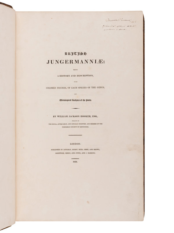 HOOKER, William Jackson, Sir (1785-1865). British Jungermanniae. Being a history and description, with coloured figures, of each species of the genus, and microscopical analyses of the parts. London: Longman, Hurst, Rees, Orme, and Brown, [1812]-1816.
