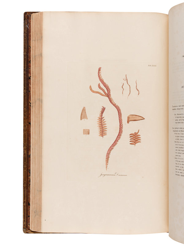 Folio (470 x 294 mm). Half-title; 88 engraved plates with hand-coloring. (Spotting to half-title and preliminary leaves, very minor spotting throughout.) Contemporary russia gilt (rebacked, some minor wear). Provenance: Dawson Turner (1775-1858), English botanist (signature, presentation inscription).