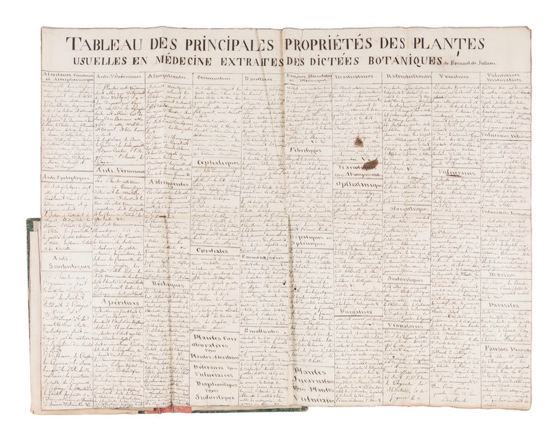 [MANUSCRIPT - BOTANY AND MINERALOGY]. [JUSSIEU, Bernard de]. "Tableau des principales propriétés des plantes usuelles en medicine extraites des dictées botaniques de Bernard de Jussieu." -- "Tableau des poisons végétaux." -- "Tableau des poisons minéraux." [France, ca 1775-1780].
