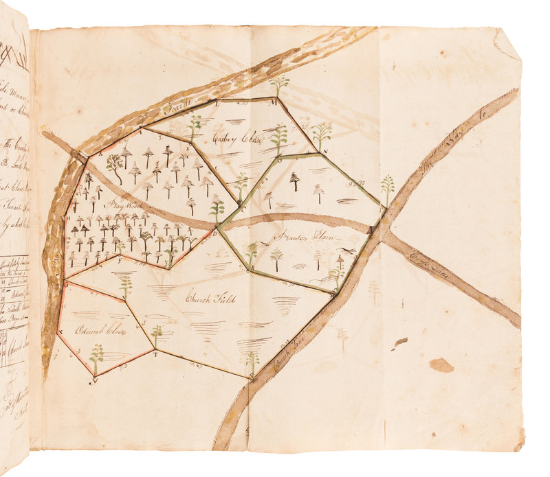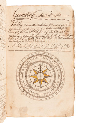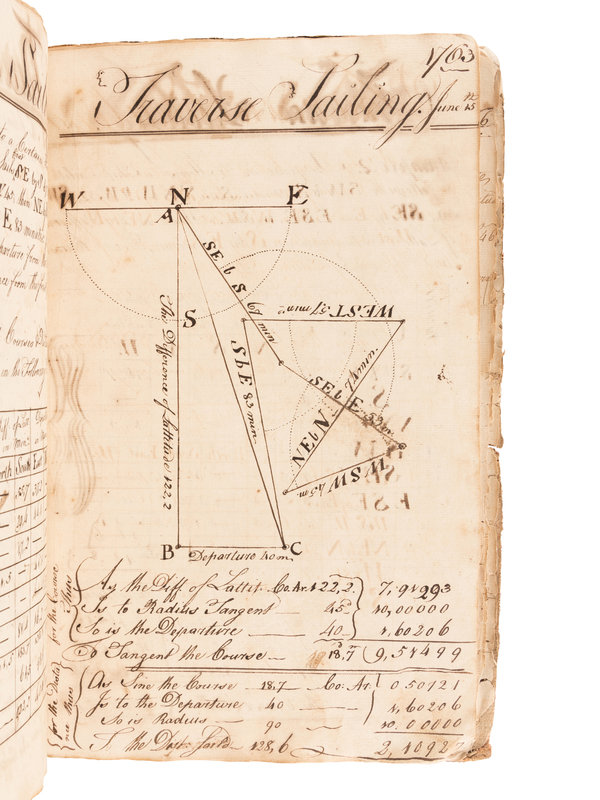 Folio (330 x 210 mm). 37 II. Manuscript in English, in ink, with diagrams, comprising Geometry and Trigonometry (ff.1-6), land surveying (ff.7-19), and plain, traverse, oblique and Mercator sailing (ff.20-37). With an elaborate surveying map, compass, and several diagrams. (Some mostly marginal chipping or tearing occasionally affecting text, small losses to the corners of two leaves.) Original red linen over boards, hand-lettered "C. E." on upper cover. (Upper hinge broken