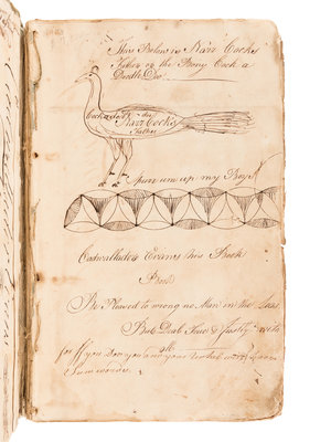 A portion of the surveying exercise appears to come from William Leybourn's The Compleat Surveyor (see the fourth edition, published 1679, pp. 292-294). Evans personalizes his ciphering book on the first page, including a drawing of his rooster, "Belon is Narr Cock's Father or the Bony Cock a Doodle Doo." The drawing includes the rooster's spurs, with a note: "Spurr um up my Boy." Evans also includes an aphorism about doing good deeds.
