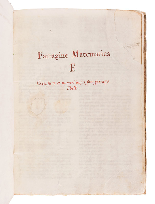The manuscript includes a variety of mathematical problems and solutions, including trigonometry and geometry. Though pp.75-76 are missing, p.77 is blank, and p.78 opens a new section titled "Problema I." The hand is incredibly neat throughout, and the errata tipped in in the same holograph suggest the work is the author's own copy. It is presumably part of a larger work, as a footnote on p.33 refers to "Farragine Matematica A." The Bern Dibner collection at Dibner Library of the History of Science and Technology at the Smithsonian Institution Libraries hold a copy of a 74pp. manuscript lettered in red and black ink also entitled "Farragine matematica," further suggesting the present manuscript is part of a larger work.