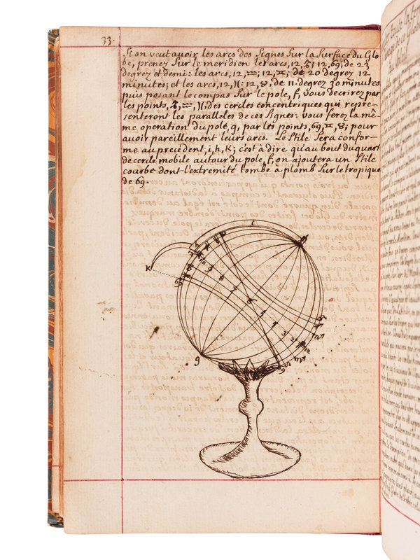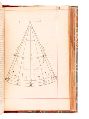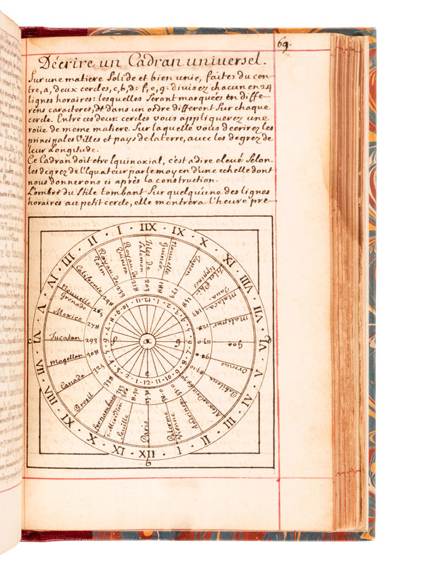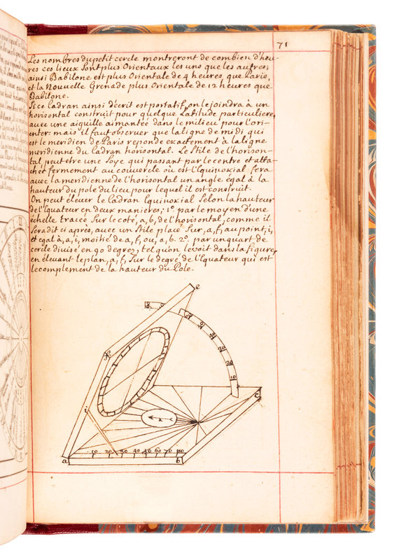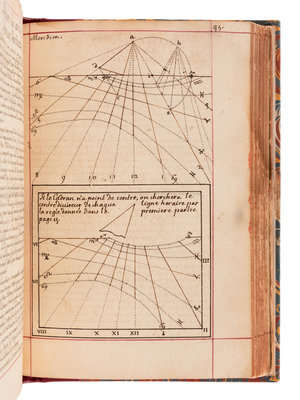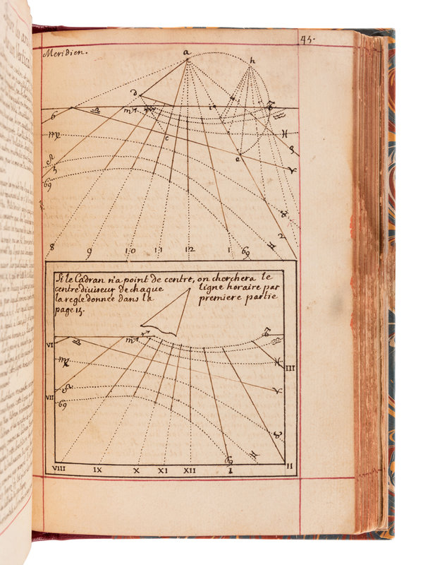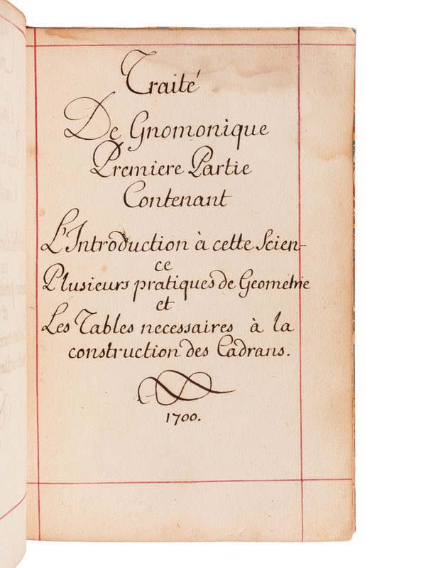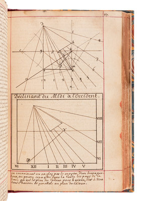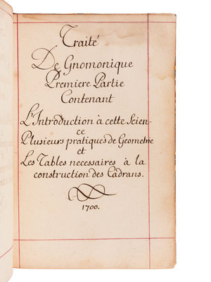 Though the manuscript is dated 1700, printed tables laid in are dated 1716. The manuscript comprises an extensive treatment of sundial theory, geometry, and the construction and application of different cadrans. It is generously illustrated throughout with accurate finely executed drawings. The second part includes information used for determining different times of the day, such as the Italian and Babylonian hours for sunrise and sunset. "Men well versed in mathematics and astronomy seem to have felt it their duty to acquaint everyone with the theory of constructing dials. It was all so simple that even the uneducated peasant should know how to build his own sundial...the dial became a scientific instrument, more dependable and lasting than any mechanical device." (Newton & Mayall, Sundials, p.19).
