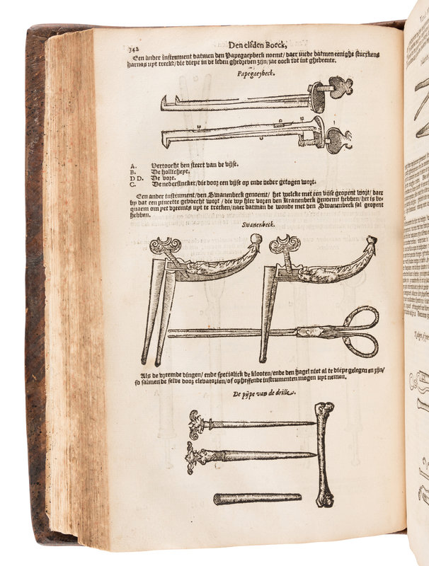 Fourth collected edition in Dutch, a reprint of the 1604 edition, printed by the same printer as the 1615 edition with his device on the title-page. According to Doe, the Dutch editions were far superior to the "very inferior" Latin edition. The Dutch editions used the same woodblocks as the French editions. Paré, one of the most notable surgeons of the European Renaissance, is considered one of the fathers of modern surgery and forensic pathology, and was a pioneer in surgical techniques and battlefield medicine. Doe pp.193-4.