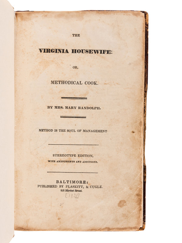 Fifth edition. The stereotype plates set for this fifth edition would be used for later printings through 1860. Mary Randolph's husband, David Randolph, was appointed federal marshal for Virginia by George Washington, of whom Mary was a distant relation. When the Randolphs fell on hard times, Mary opened a boardinghouse in their home. She published this collection of recipes, drawn primarily from African American and Southern cooking, but also including recipes from a broader influence, such as "gaspacho." Her motto on the title reveals: "Method is the Soul of Management. Bitting, p.388; Lowenstein 228. See Cagel and Stafford 628-631.