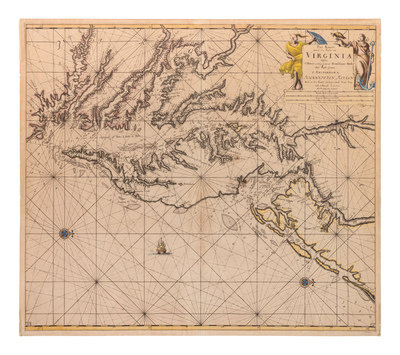 Engraved map with hand-coloring in outline of the Chesapeake and Delaware Bay region, 530 x 603 mm sheet. Figural cartouche, galleon, compass roses. (Some overall browning, a few short tears occasionally crossing image.)