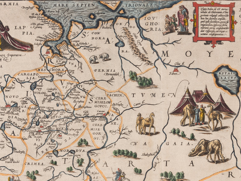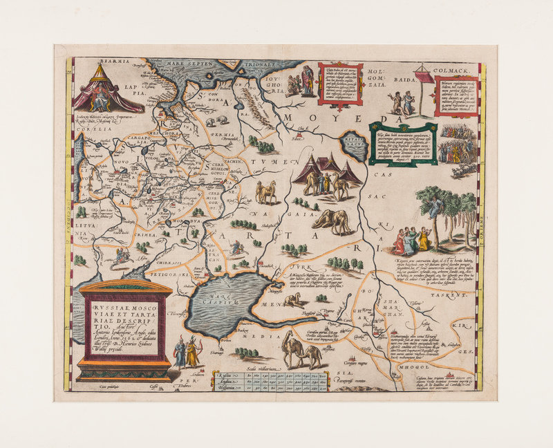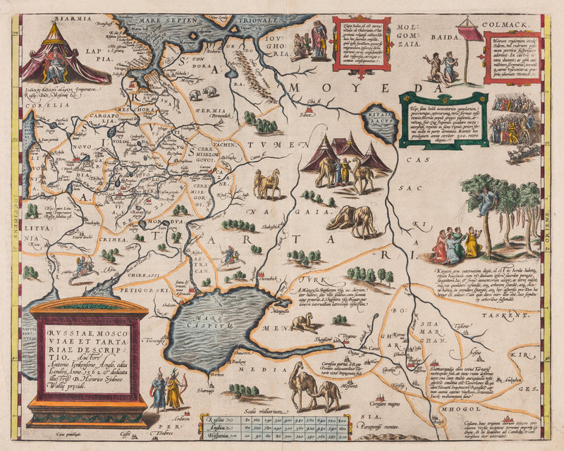 The map, based on the surveys of English merchant Anthony Jenkinson, includes a depiction of Ivan the Terrible top left, with illustrations of encampments, armies, Cossacks, and a burial scene with the dead hanging from trees. Van den Broecke, 162.
