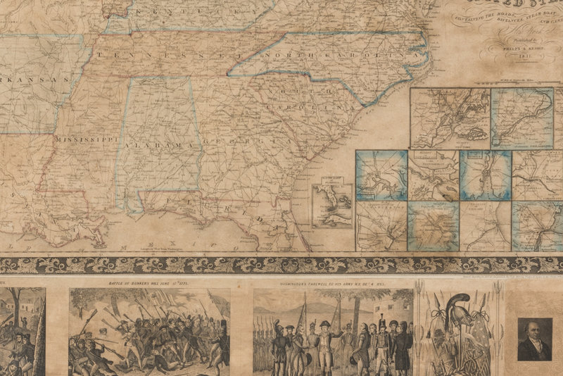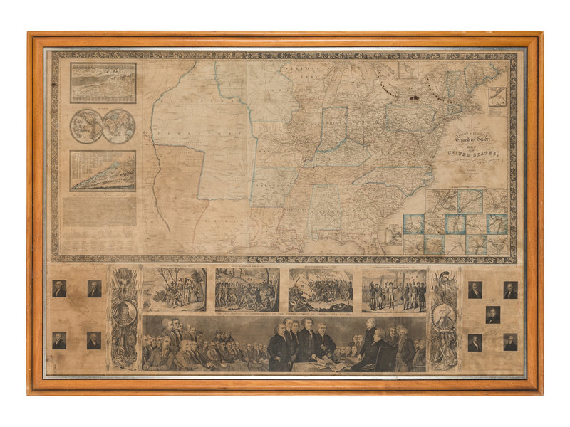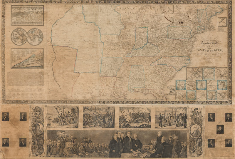 Steel-engraved wall map of the United States on 5 sheets hand-colored in outline, 671 x 987 mm visible area, framed (unexamined out of frame). Map within ornate border, insets of a world map, chief rivers of the world, principal mountain ranges, and the text of the Declaration of Independence reproducing the signatures and with a cartoon rendering of the signing, inset plans of New York, Philadelphia, Boston, Baltimore, New Orleans, Mobile, Cincinnati, St. Louis, Charleston, Pittsburgh, Chicago, Detroit, and the District of Columbia; several steel-engraved vignettes in bottom margin (see below). (Some overall browning, some cracking or minor losses, a few stains.)