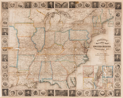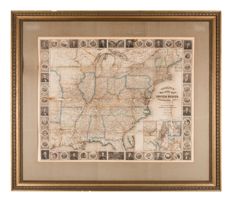 Steel-engraved wall map of the United States on 5 sheets hand-colored in outline, 532 x 822 mm visible area, matted and framed (unexamined out of frame). Map within pictorial borders, inset plans of Washington D. C., New York, Baltimore, Boston, Birmingham, Cincinnati, St. Louis, and Chicago. (Separations with minor losses along folds repaired verso, map backed with linen, some overall browning.)