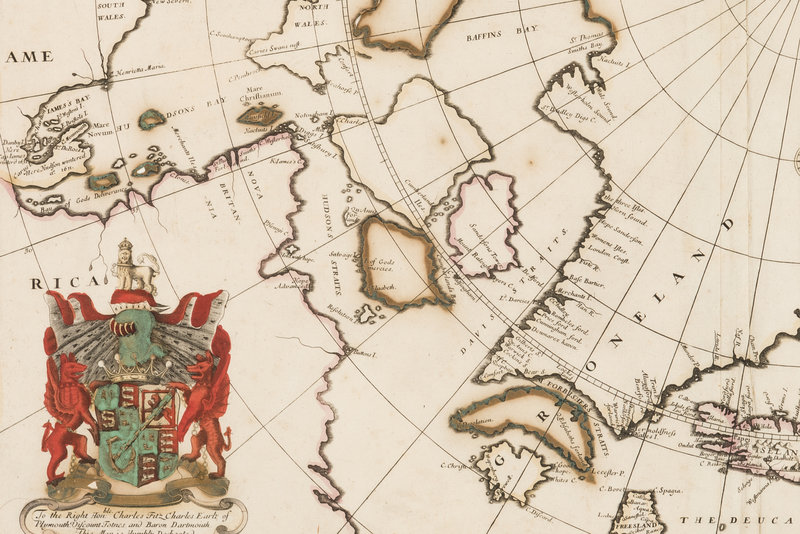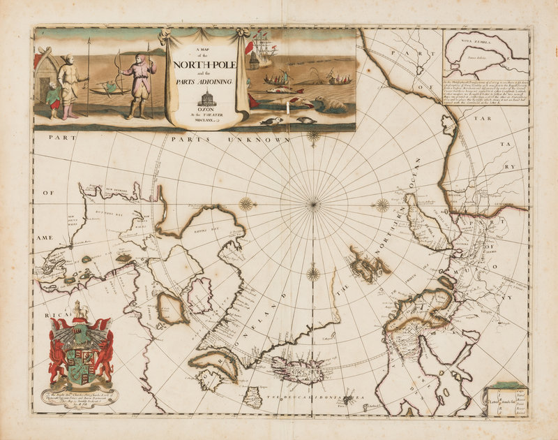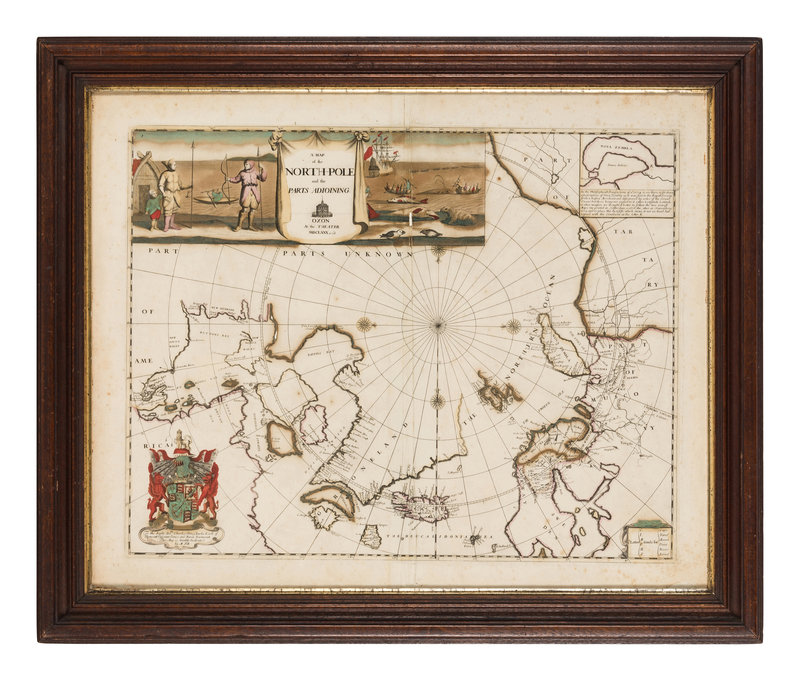 Engraved map of the North Pole with hand-coloring in wash and outline, 525 x 653 mm visible area, matted and framed (unexamined out of frame). Inset map of Nova Zembla, inset whaling vignette, dedicatory cartouche with coat of arms. (Some minor burn-through of pigment, some minor soiling.)