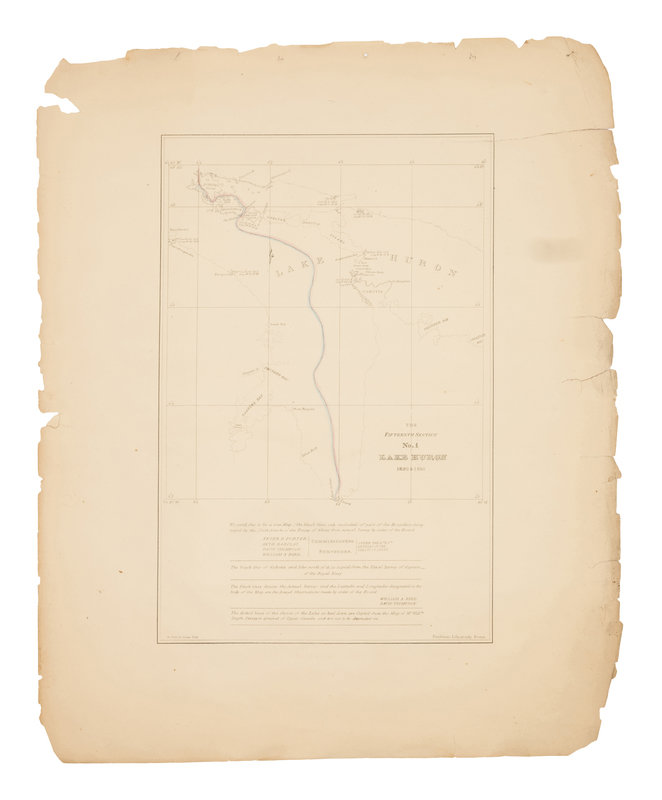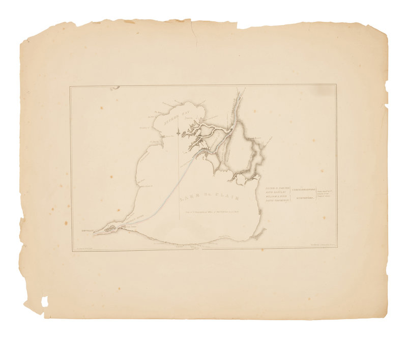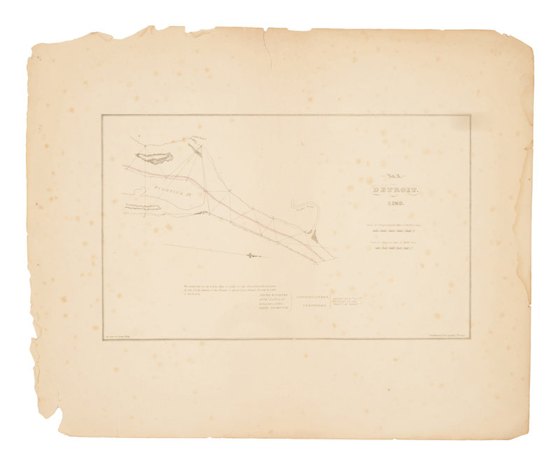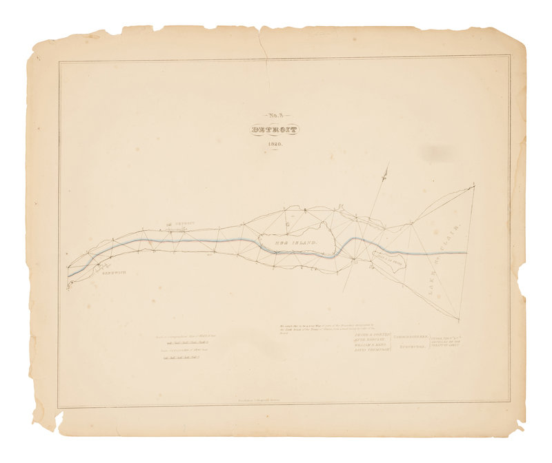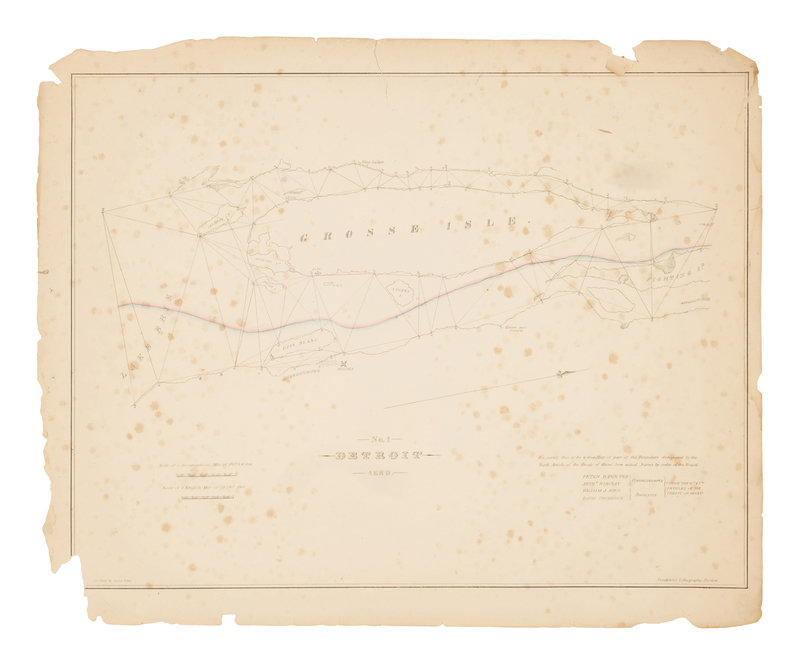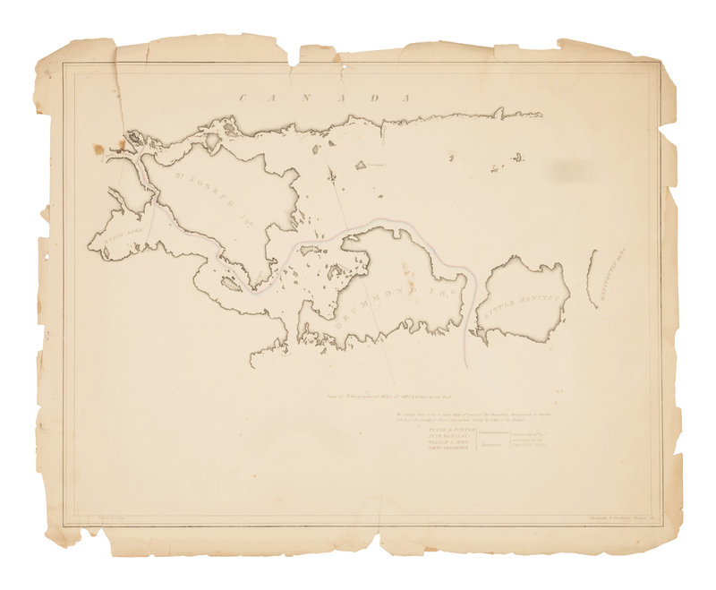 Rare set of maps denoting the boundaries between the United States and Great Britain in the Great Lakes region after the War of 1812 according to the 6th and 7th articles of the Treaty of Ghent. Each map is “shaded on the British side with red, and on the American side with blue” with information about the commissioners and surveyors (Decision of the Commissioners). "Neither the series nor individual maps is recorded in Phillips or Karpinski. The only copy located by the Union Catalog is in the U. S. State Department Library. This folio edition is not to be confused with the octavo edition that consists only of text" (Streeter sale 1080).