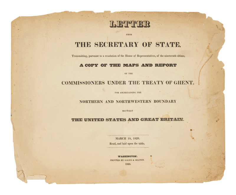[U.S. DEPT. OF STATE] – Letter from the Secretary of State, Transmitting, pursuant to a resolution of the House of Representatives, of the nineteenth ultimo, a Copy of the Maps and Report of the Commissioners under the Treaty of Ghent, for Ascertaining the Northern and Northwestern Boundary between the United States and Great Britain. Washington, D.C.: Gales & Seaton, 18 March 1828.