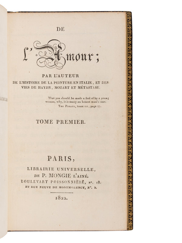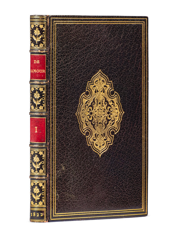 [With:] BEYLE, Marie Henri ("Stendhal") (1783-1842). De l'amour. Paris: Librairie Universelle, de P. Mongie, 1822. One volume only (of 2, lacking volume II), 12mo (153 x 89 mm). Half-title. 20th-century morocco gilt, sides with central gilt arabesque, spine in 6 compartments with 5 raised bands, 2 with red morocco lettering-pieces gilt, the rest gilt-decorated, edges gilt, turn-ins gilt, stamp-signed by R. Petit. Provenance: Lowther family (bookplate on pastedown, hand-numbered 61396). FIRST EDITION. "Ouvrage fort recherche: son "titre" en est une raison, qui, sans dominer les autres est un fait. Un livre hardi et froidement realiste qui fit sensation a l'epoque" (Carteret II, 346). THE LOWTHER FAMILY COPY.