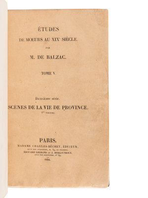 FIRST COLLECTED EDITION. The present single volume, the first volume in the second series, Scènes de la vie de province, includes the first publication of Eugenie Grandet, widely considered to be Balzac's first great novel. Etudes de moeurs au XIXe siecle was published in 12 volumes comprising three series each in 4 volumes: Scènes de la vie privée, Scènes de la vie de province, and Scènes de la vie parisienne. THE LOWTHER FAMILY COPY.