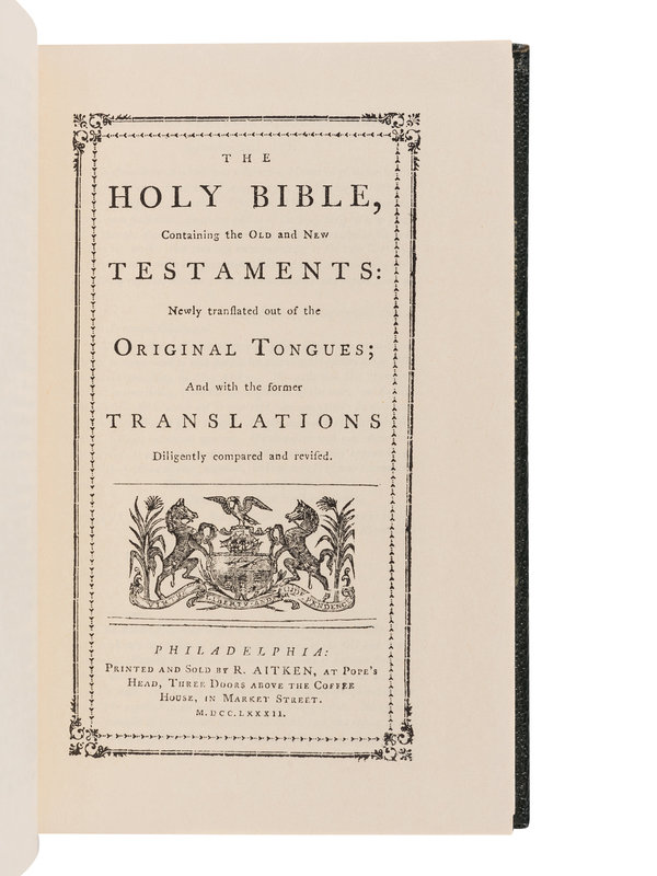 [With]: [BIBLE, in English]. The Holy Bible as Printed by Robert Aitken... New York: Arno Press, 1968. 2 volumes, 8vo. Original green leather binding gilt. Facsimile of the Aitken Bible (published in 1782), the "American Bible Society Edition."