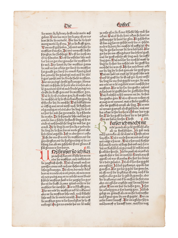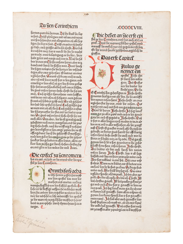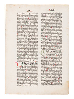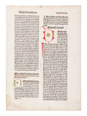 [BIBLE, in German -- PRINTED LEAF]. Single leaf, from a Koberger Bible, ca 1483.
