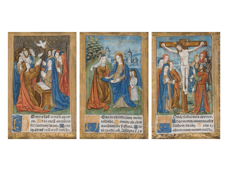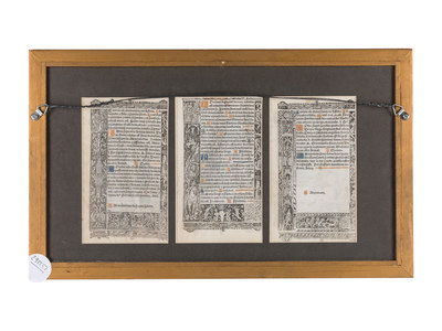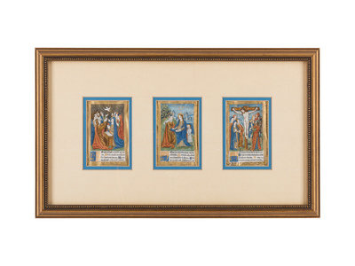 Together 5 leaves on vellum, 3 of which matted and framed together (unexamined out of frame). Framed dimensions 508 x 305 mm. Leaves each approximately 203 x 127 mm or smaller. Comprising:
