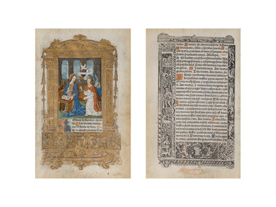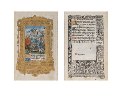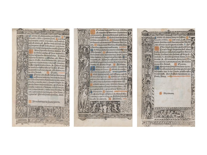 [BOOK OF HOURS]. HARDOUYN, Gilles and Germain (Paris, ca. 1500). A group of 5 printed leaves from a French Book of Hours, likely executed in the workshop of Gilles and Germain Hardouyn (Active ca. 1491-1541). Latin.