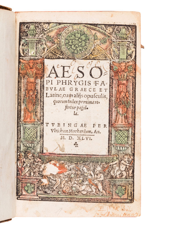 AESOP (ca 620-560 B.C.). Aesopi Phrygis Fabulae Graece et Latine, cum aliis opusculis, quorum Index proxima refertur pagella. Tübingen: Ulrichus Morhardum, 1546.