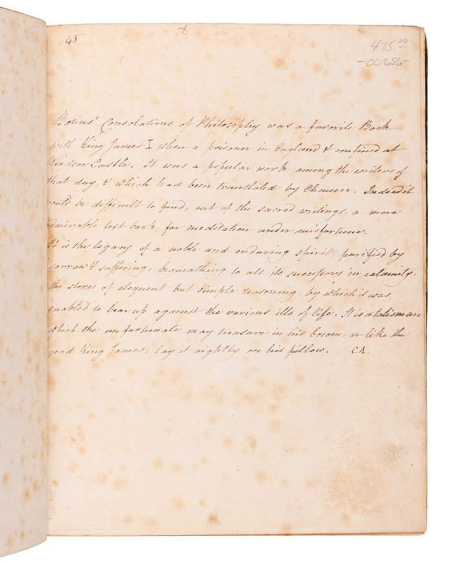 FIRST EDITION of Bellamy the Elder's work, which was revised by his son, Bellamy the Younger, who was a Chaplain of Petersham and Kew in Surry. This work contains five parts, the first of which is “The Comforts of Philosophy: in five books, from the Latin of Boetius” (p. v). The inscription notes: “Botius’ [sic] Consolations of Philosophy was a favorite book with King James I when a prisoner in England and confined at Windsor Castle. It was a popular work among the writers of that day, and which had been translated by Chaucer. Indeed it would be difficult to find, out of the sacred writings, a more admirable text book for meditation under misfortune. It is the legacy of a noble and enduring spirit, fortified by sorrow and suffering, bequeathing to all its successors in calamity, the stores of eloquent but simple reasoning, by which it was enabled to bear up against the various ills of life, it is a talisman which the unfortunate may treasure in his bosom, or like the good King James, lay it nightly on his pillow. C.A.”