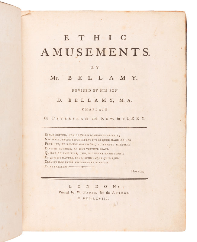 BELLAMY, Daniel, the Elder (1687-?). Ethic Amusements. BELLAMY, Daniel, the Younger (ca 1715-1788), reviser. London: W. Faden, 1768.