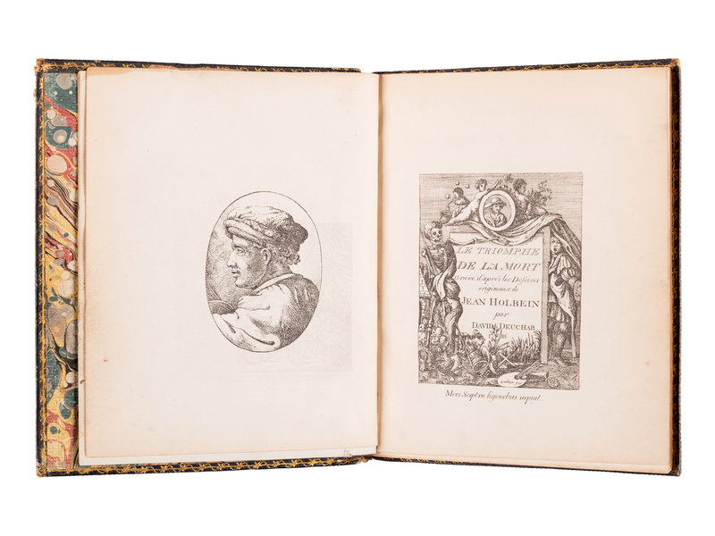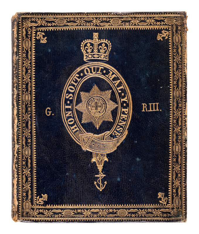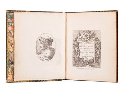 4to (179 x 144 mm). Additional engraved title for "Le Triomphe de la Mort," dated 1786, frontispiece portrait, 46 engravings by David Deuchar after Holbein. Contemporary blue morocco gilt, covers with floral border, anchor tools in corners, upper cover with central ornament of Garter badge and collar surmounted by a crown and with anchor underneath, flanked by the initials "G. R.III.", smooth spine in 6 compartments (hinges starting, some light wear). Provenance: George III (1738-1820), King of Great Britain and Ireland (binding); his third son, William Henry, Duke of Clarence (1765-1837), later King William IV (bookplate); his eldest illegitimate son George Augustus Frederick FitzClarence (1794-1842), English peer (his bookplates as Col. FitzClarence and the Earl of Munster); John Gerard Heckscher (1837-1908), American book collector (bookplates).