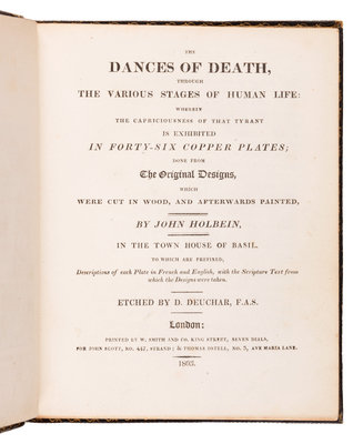 HOLBEIN, Hans (1497-1543). The Dances of Death, through the various stages of Human Life: wherein the capriciousness of that tyrant is exhibited in Forty-Six Copper plates. London: W. Smith and Co., for John Scott & Thomas Ostell, 1803.