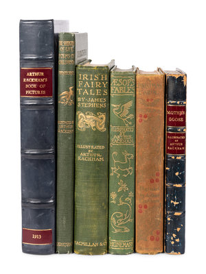 Aesop’s Fables. London and New York: William Heinemann, Double Day Page & Co., 1912. 4to. “Arthur Rackham Exhibition” leaf laid in. Riall p. 111; Latimore & Haskell pp. 38-39. – Arthur Rackham’s Book of Pictures. New York: The Century Co., 1913. 4to (262 x 198 mm). 19th-century blue calf, red morocco lettering-pieces gilt. – Charles, DICKENS. A Christmas Carol. London and Philadelphia: William Heinemann, J.B. Lippincott Co., 1915. Stamped in black; original pictorial dust jacket printed in red and green. Latimore & Haskell, p.45.-- SWINBURNE, Algernon Charles. The Springtide of Life Poems of Childhood. London: William Heinemann, 1918. – STEPHENS, James. Irish Fairy Tales. London: MacMillan & Co. Ltd., 1920. – Mother Goose The Old Nursery Rhymes. London: William Heinemann, [N.d.]. 19th-century blue polished calf gilt, red morocco lettering-pieces gilt, edges gilt, stamp-signed ZAEHNSDORF. -- Together, 6 works in 6 volumes, 8vo (except where noted), color printed frontispieces, illustrated title-pages, numerous color printed plates (many tipped in), numerous illustrations, all in original publisher’s green cloth gilt (except where noted), condition generally good.