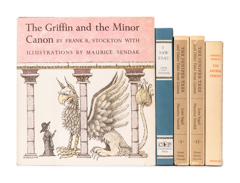 STOCKTON, Frank R. (1834-1902). The Griffin and the Minor Canon. New York, Chicago, and San Francisco: 1963. 8vo. Publisher’s original binding, dust jacket.. Stated first edition. -- JARRELL, Randall (1914-1965). The Animal Family. New York: Pantheon, 1965. 12mo. Publisher’s original decorated blue cloth, dust jacket. -- SEGAL, Lore. (B.1928). The Juniper Tree and Other Tales from Grimm. New York: Farrar, Straus and Giroux, 1973. 2 volumes. 12mo. Publisher’s original cloth, dust jacket, slipcase. Stated first edition. -- OPIE, Iona and Peter (Editors). I Saw Esau: The Shoolchild’s Pocket Book. Cambridge, MA and London: Candlewick Press and Walker Books, 1992. 8vo. Publisher’s original boards, dust jacket-- And 9 more. -- Condition generally good. -- Complete list available upon request.