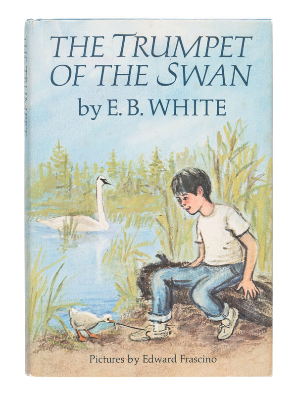WHITE. The Trumpet of the Swan. Edward Frascino, illustrator. New York, Evanston, and London: Harper & Row, 1970. 8vo. Illustrated. Publisher’s blue cloth stamped in silver and gold, (some light fading to extremities); original pictorial dust jacket (corners of front flap clipped, rust-stain from paperclip on lower panel, a few wrinkles to top edges, some minor chipping). FIRST EDITION.