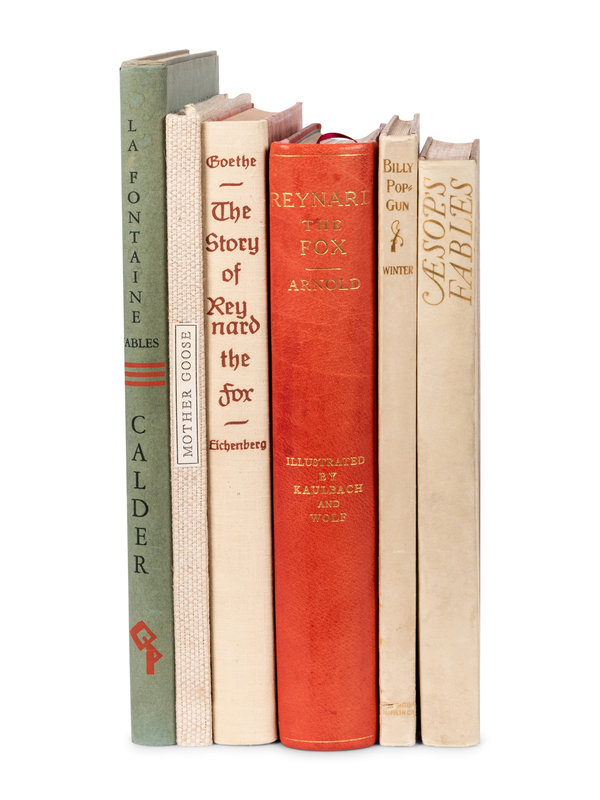ARNOLD, Thomas James (ca.1804 – 1877). Reynard the Fox after the German Version of Goethe. Boston: Roberts Brothers, 1887. 4to. 60 illustrations after the designs of Wilhelm von Kaulbach and 12 engravings by Joseph Wolf. Half morocco, titles gilt. LIMITED EDITION, number 355 of 400 deluxe copies printed, SIGNED by Roberts Bros. -- Winter, Milo (1888-1956). Billy Popgun. Boston and New York: Houghton Mifflin Company, 1912. 4to. 8 color plates by the author. Vellum-backed boards, titles gilt, top edge gilt. Very light rubbing to the corners. Stated first edition. LIMITED EDITION, number 11 of 350 copies, of which only 300 were for sale. -- Aesop’s Fables. New York: The Limited Editions Club, 1933. 4to. Numerous illustrations after original, Florentine woodcuts. Original vellum-backed boards, slipcase, top edge gilt. LIMITED EDITION, number 825 of 1500 copies signed by the designer, Bruce Rogers. -- Mother Goose: Twenty Nursery Rhymes. San Francisco: Grabhorn-Hoyem: 1970. 4to. 20 illustrations by Philip van Aver. Original tan linen, printed paper labels to upper cover and spine. LIMITED EDITION, one of 300 unnumbered copies. Grabhorn-Hoyem Bibliography 40. -- And 23 more. --Together 27 works in 28 volumes, condition generally good. Complete list available upon request.