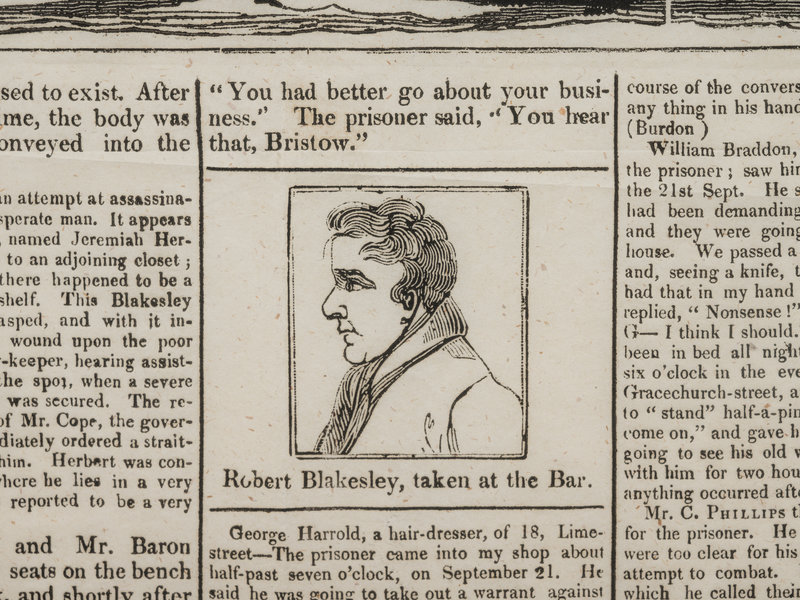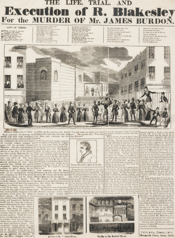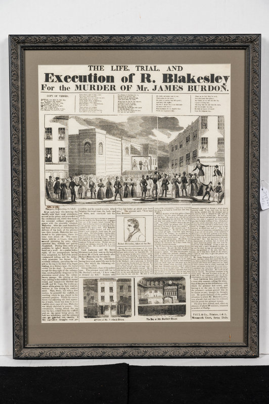 Broadside (visible area 482 x 355 mm). large woodcut of Newgate scaffold and surrouding area with a large crowd, smaller woodcuts of Blakesley, and interior and exterior views of Mr. Burdon's house, text printed within 5 columns. Matted and framed (unexamined out of frame).