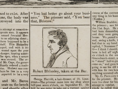 The text and poem cover the particulars of Mr. Blakesley's execution by hanging, his attempted escape (hitting his jailer with a candlestick), the testimony of two city policemen, a hairdresser, and his own father, and the jury's guilty ruling. An unusually large and profusely illustrated 19th-century crime broadside.