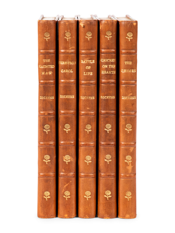 5 volumes, 12mo. Half-titles; titles printed in red and black; frontispieces and vignette titles. Original half calf, marbled boards, top edges gilt, others uncut (some minor scuffing). Scarce collected edition of Dickens's Christmas classics.