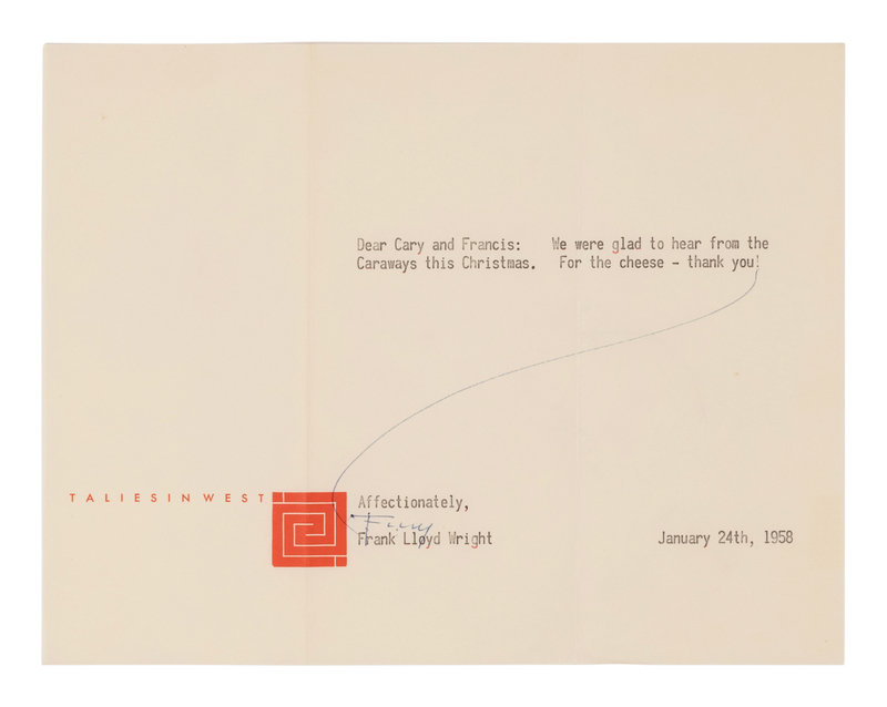 Wright sends a note of thanks for a holiday gift. In full: "Dear Cary and Francis [sic]: We were glad to hear from the Caraways this Christmas. For the cheese - thank you! Affectionately, Frank Lloyd Wright."