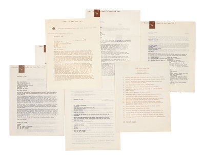 [PUBLIC RELATIONS]. Carbon copy typescripts, primarily from Sept.-Dec. 1956. Ca 123pp, on letterhead. Correspondence from Franklin R. Ullrey and others from public relations firm Harshe-Rotman Inc. Relating to promotional activities, press releases, media appearances, promotional photographs, the establishment of Frank Lloyd Wright Day in Chicago, and Wright's appearance on the gameshow "I've Got a Secret," and a schedule for his media appearances on 7 September 1956. Harshe-Rotman was retained as public relations for the announcement of the Frank Lloyd Wright Endowment Fund.