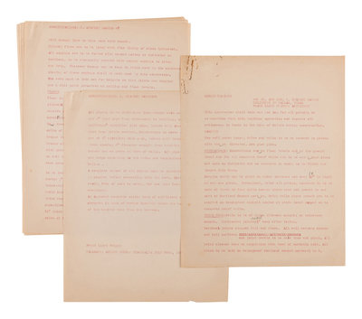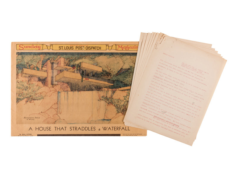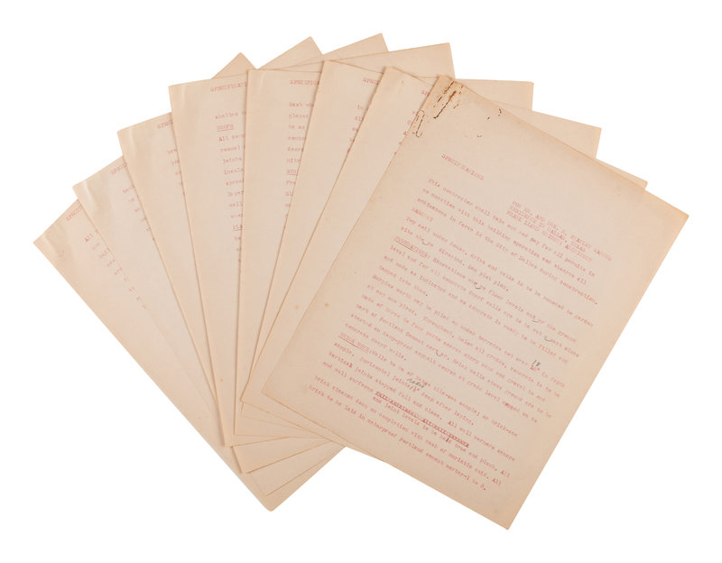 [With:] [STANLEY MARCUS HOUSE]. Carbon typescript draft, "Specifications for Mr. and Mrs. H. Stanley Marcus Residence in Dallas, Texas. Frank Lloyd Wright: Architect." 8pp., printed in red ink, with several pencil corrections, creased, paperclip remnants upper left corner. Includes specifications for the foundation, brick work, floors, millwork, structural steel, glass, painting, roof, plaster, sheet metal, hardware, wiring, heating, and plumbing. Stanley Marcus famously fired Wright in the middle of the project for running over budget; Roscoe DeWitt finished the construction of the home.