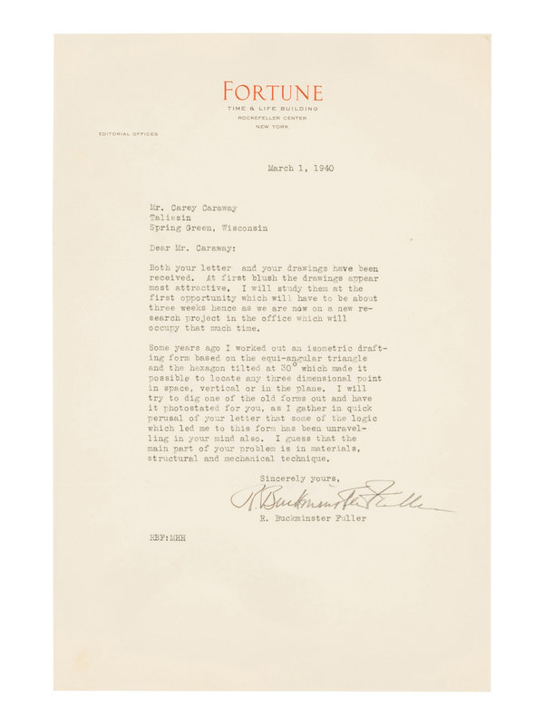 FULLER, R. Buckminster (1895-1983). Typed letter signed ("R. Buckminster Fuller"), to Carey Caraway. New York, 1 March 1940.