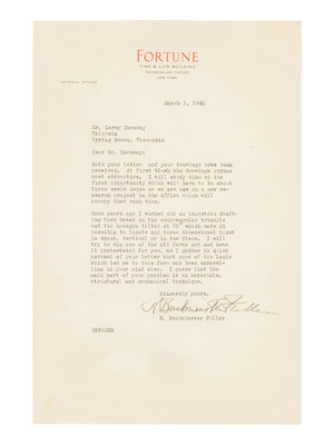 Renowned architect Buckminster Fuller writes Caraway about some drawings he sent offering to study them at his first opportunity in a few weeks. He continues with some architecture and design advice: "Some years ago I worked out an isometric drafting form based on the equi-angular triangle and the hexagon tilted at 30° which made it posible to locate any three dimensional point in space, vertical or in the plane...some of the logic which led me to this form has been unraveling in your mind also. I guess that the main part of your problem is in materials, structural and mechanical technique."