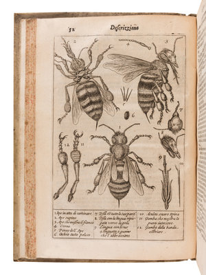 FIRST EDITION of Stelluti's translation, and THE FIRST BOOK TO CONTAIN ILLUSTRATIONS OF NATURAL OBJECTS AS SEEN THROUGH THE MICROSCOPE. Stelluti, a friend of Galileo and a founder of the Accademia Dei Lincei, used a microscope given to his fellow founder Federico Cesi by Galileo, which he used to make detailed observations of insects. Stelluti's illustrations of the honeybee first appeared in an extremely rare broadside by Cesi in 1625 (known in two copies), but the Persio contains the first such illustrations to appear in a book. Garrison-Morton 259; Nissen ZBI 3988; Wellcome I:4917.
