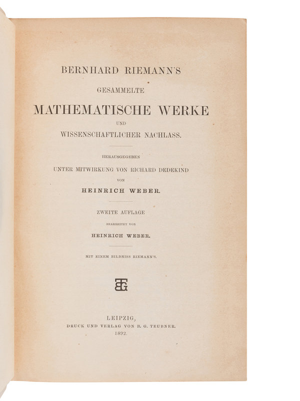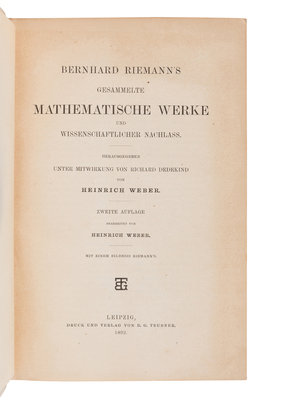 RIEMANN, Georg Friedrich Bernhard (“Bernhard Riemann”) (1826-1866). Gesammelte Mathematische Werke und Wissenschaflicher Nachlass. Herausgegeben Unter Mitwirkung von Richard Dedekind von Heinrich Weber. Heinrich WEBER (1843-1912 ), and Richard DEDEKIND (1831-1916), editors. Leipzig: B.G. Teubner, 1892.