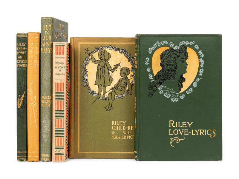 RILEY, James Whitcomb (1849-1916). Riley Child-Ryhmes. 1898. 8vo. Hoosier Pictures by Will Vawter. Original green publisher's decorated cloth. -- RILEY. Riley Love-Lyrics. 1905. 8vo. Illustrated by William B. Dyer. Original green publisher's decorated cloth. -- RILEY. Riley Love-Lyrics. 1905. 8vo. Illustrated by William B. Dyer. Original green publisher's decorated cloth. -- A second copy. -- RILEY. Farm-Rhymes. 1905. 8vo. Country pictures by Will Vawter. Original green publisher's decorated cloth. -- And 2 more. -- Together, 5 works in 6 volumes. -- Complete list available upon request.