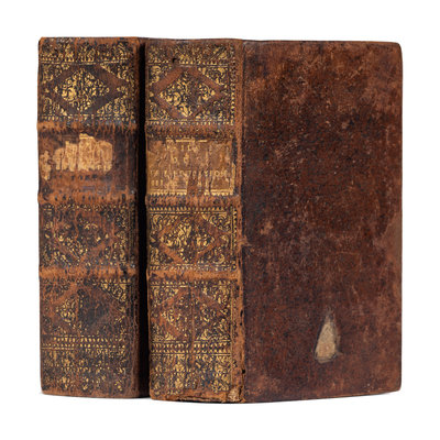 4 volumes in 2, 12mo (159 x 98 mm). Half-titles to vols. I and III, titles printed in red and black, 5 engraved plates by Le Grand, de Longueil and Pasquier after Eisen. (Lacking half-titles Vols.II & IV.) Contemporary mottled calf, spines gilt, tan morocco lettering-pieces gilt, edges stained red (some light wear, chipping with losses to lettering-pieces).