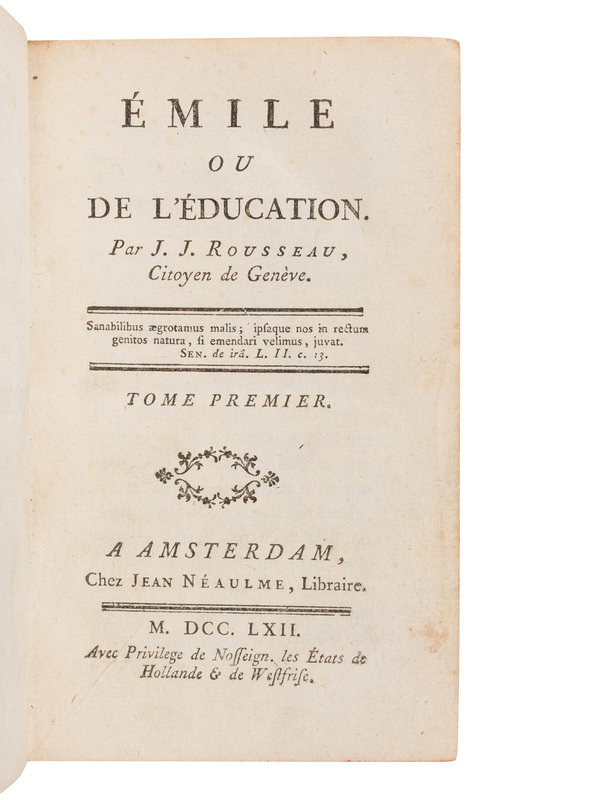 ROUSSEAU, Jean Jacques (1712-1778). Emile, ou de l'education. Amsterdam: Neaulme [but Lyon: Bruyset], 1762.