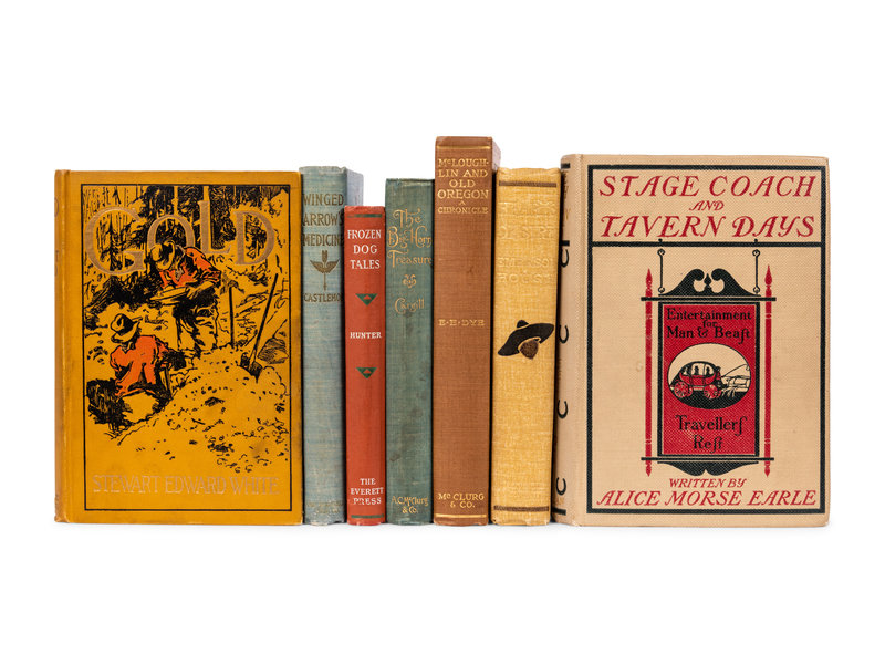 CARGILL, John F. (1857-1921). The Big Horn Treasure. Chicago, A.C. McClurg and Company, 1897. 8vo. Original publisher’s decorated blue cloth. -- DYE, Eva Emery (1855-1947). McLoughlin and Old Oregon. Chicago, A.C. McClurg and Company, 1900. 8vo. Original publisher’s decorated yellow cloth. -- CASTLEMON, Harry (1842-1915). Wigned Arrow’s Medicine. Akron, OH, New York, Chicago: The Saalfield Publishing Company, 1901. 8vo. Illustrations by W.H. Fry. Original publisher’s decorated blue cloth. -- HOUGH, Emerson (1857-1923). Heart’s Desire…. New York & London: The Macmillan Company, 1905. Numerous illustrations. Original publisher’s decorated yellow cloth. -- HUNTER, Colonel William C. Hunter. Frozen Dog Tales and Other Things. Boston: The Everett Press Company, 1905. 8vo. Illustrations by F. Holme and R.H. Hynes. Original publisher’s decorated red cloth. -- WHITE, Stewart Edward (1873-1946). Gold. Garden City, NY: Doubleday, Page & Co., 1913. Small 8vo. Frontispiece and illustrations by Thomas Fogarty. Original publisher’s decorated yellow cloth. -- EARLE, Alice Morse (1851-1911). Stage Coach and Tavern Days. New York & London: The Macmillan Company, 1915. 8vo. Numerous illustrations. Original publisher’s decorated tan cloth. -- Together, 7 works in 7 volumes, condition generally fine.