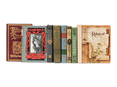 KHAYYAM, Omar (1048-1131). Rubaiyat. Translated by Edward Fitzgerald. New York and Boston: Thomas Y. Crowell & Co., nd. Original publisher’s decorated pictorial cloth. -- MOORE, Thomas. Lalla Rookh. New York: Chatterton-Peck Company, nd. Original publisher’s decorated green cloth. -- TENNYSON, Alfred (1809-1892). The Princess, Maud. Chicago: Donohue, Henneberry & Co., nd. Original publisher’s decorated blue cloth. -- TENNYSON. Through the Year with Tennyson. Boston: DeWolfe, Fiske & Co., nd. Original publisher’s decorated blue cloth. -- LUBBOCK, Sir John (1834-1913). The Pleasures of Life. Philadelphia: Henry Altemus, 1842. Original publisher’s decorated blue boards. -- HODGE, Charles (1797-1878). The Way of Life, with an Analytical Index. Philadelphia: American Sunday-School Union, 1869. Original publisher’s decorated dark blue cloth. -- STOWE, Harriet Beecher (1811-1896). Uncle Tom’s Cabin. Philadelphia: Henry Altemus, 1894. Original publisher’s decorated green cloth. -- PITTENGER, William (1840-1904). Toasts, And Forms of Public Address…. Philadelphia: The Penn Publishing Company, 1908. Original publisher’s decorated green cloth. -- BUSCH, Wilhelm (1832-1908). Edward’s Dream. Chicago: The Open Court Publishing Company and London: Kegan Paul, Trench, Trubner & Co., 1909. Original publisher’s decorated burgundy cloth. -- Together, 9 works in 9 volumes, condition generally fine.