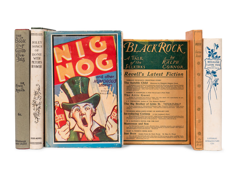 Because I Love You, poems of love. Selected by Anna E. Mack. Boston: Lothrop, Lee, and Shepard Co., 1894. 8vo. Original publisher’s cloth, original pictorial dust jacket. -- CONNOR, Ralph (1860-1937). Black Rock: A Tale of the Selkirks. New York, Chicago, and Toronto: 1900. 8vo. Original publisher’s cloth, original pictorial dust jacket. -- TRASK, Katrina (1853-1922). Night & Morning. London and New York: John Lane, 1907. 8vo. Original publisher’s cloth, original pictorial dust jacket (clipped). -- RILEY, James Whitcomb (1849-1916). Songs of Home. Indianapolis: The Bobbs-Merrill Company, 1910. 8vo. Pictures by Will Vawter. Original publisher's cloth, original pictorial dust jacket. -- ARNOLD, Sir Edwin Arnold (1832-1904). The Book of Good Counsels, from the Sanskrit of the Hitopadesa. Edinburgh: John Grant, 1924. 8vo. Illustrations by Gordon Browne. Original publisher’s cloth, original pictorial dust jacket. -- WALLACE. Edgar (1875-1932). Nig Nog and other Humorous Stories. Cleveland and New York: The World Syndicate Publishing Co., 1934. 8vo. Original publisher’s cloth, original pictorial dust jacket (clipped).
