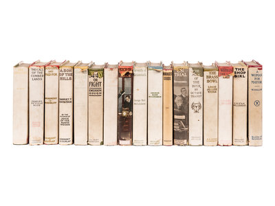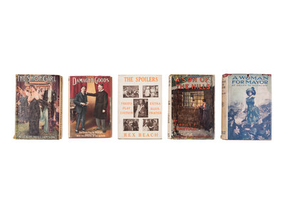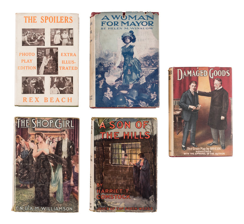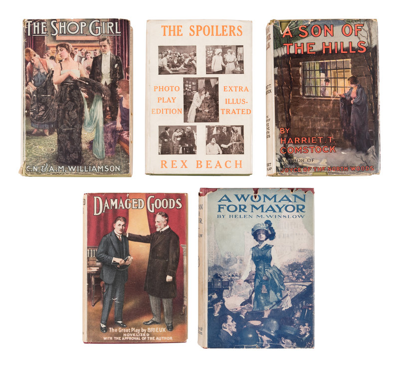 SINCLAIR, Upton. Damaged Goods the Great Play "Les Avaries" of Brieux Novelized with the approval of the author. Philadelphia: The John C. Winston Company, 1913. -- MCCUTHEON, George Barr. Graustark The Story of a Love Behind a Throne. New York: Grosset & Dunlap, 1901. -- BROADHURST, George and Arthur HORNBLOW. Bought and Paid for A Story of To-Day. New York: Grosset & Dunlap Publishers, 1912. PHOTOPLAY EDITION. -- BUCK, Charles Neville. The Call of the Cumberlands. 1913. Dustin Farnum Edition. PHOTOPLAY EDITION. SIGNED by Dustin FARNUM. -- BEACH, Rex. The Spoilers. New York: A.L. Burt, Company, 1906. PHOTO PLAY EDITION. EXTRA ILLUSTRATED. -- And 12 others. Together 17 works in 17 volumes, all 8vo, many with frontispieces, all in original publisher’s pictorial cloth bindings, all with original publisher’s pictorial dust jackets (with some overall chipping, soiling), most FIRST EDITIONS.