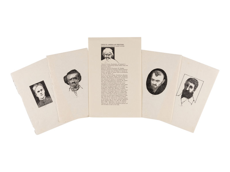 The additional suite of plates which accompanied the limited edition of 50 copies of Twelve American Writers, each SIGNED BY MOSER. Printed by Moser for Dwyer & Cronin Booksellers, Amherst, it is the first commissioned book of the Pennyroyal Press. Accompanied by a signed prospectus for Twelve American Writers, illustrated with a small wood engraving of Mark Twain. See Pennyroyal Checklist 9.